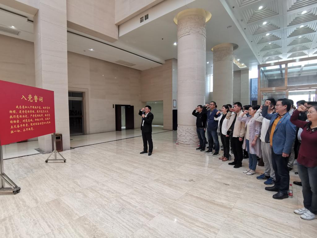 走进展厅,首先看到的是名为“潇湘魂”的毛泽东、刘少奇、任弼时大型伟人半身雕塑,三位伟人亲切、伟岸的形象近在眼前,令人倍感振奋。右侧中国共产党党旗鲜艳夺目,气氛庄重肃穆。在院党委书记王宏的带领下,全体师生党员面对伟人雕像和中国共产党党旗,重温入党誓词。