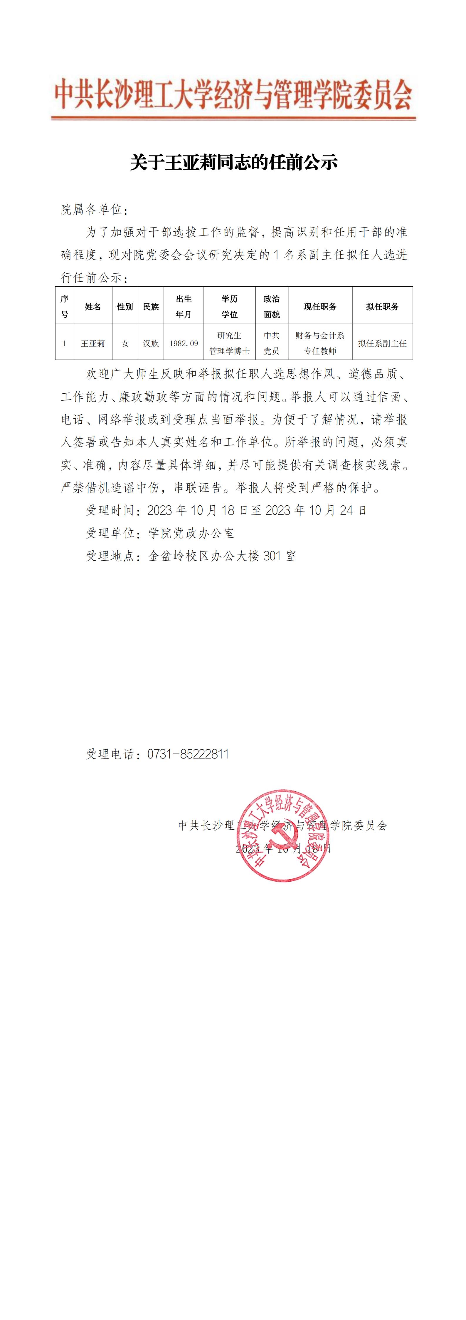 关于王亚莉同志的任前公示