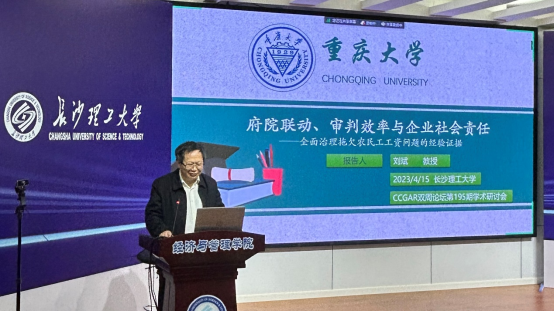 刘斌教授作了题为“府院联动、审判效率与企业社会责任”的主题报告。刘教授从选题缘起、研究假设、实证结果、总结启示四个方面展开报告,最后指出《关于全面治理拖欠农民工工资问题的意见》实施后,在府院联动的有力执行下,地方法院提升了对拖欠农民工工资案件的判效率,推动了用工企业工资支付责任的及时履行。