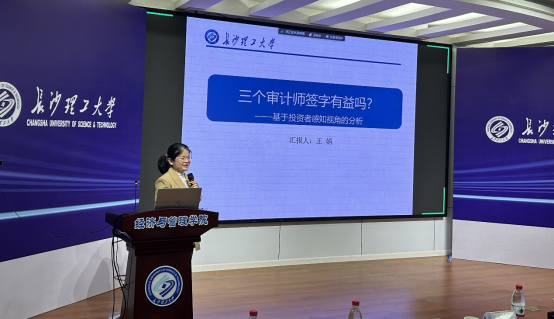 王娟老师作了题为“三个审计师签字有益吗?——基于投资者感知视角的分析”的主题报告。王老师分析了三个审计师签字对长期盈余反应系数的影响、对审计质量影响的作用机理、三个审计师签字能否改善公司财务绩效和市场业绩。