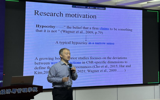 杜兴强教授作了题为“伪善会降低公司价值吗?来自中国的证据”的主题报告。杜教授着重介绍了研究动机、研究方法、实证过程、研究结果,指出伪善会降低公司价值,分析师的报道弱化了伪善对公司价值的负面影响。