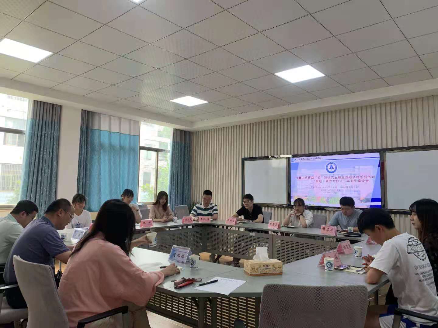 2021年6月7日下午2:30,我院研究生职业规划项目系列之毕业生座谈会于金盆岭校区七教206教室举办,经管学院副院长彭新宇教授、王治教授出席了此次会议,会议由辅导员周路路老师主持,我院18级管理班班长邹瑶、18级非全脱产班陈庆等各专业毕业生代表参会。