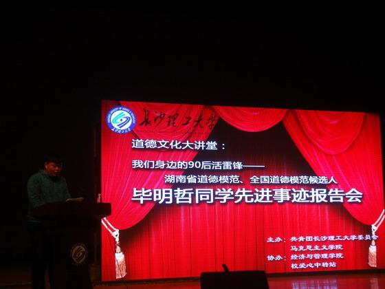 报告会伊始,学工部邹兴平部长向大家大致介绍了本次道德文化大讲堂的主人公,来自经管学院工商管理1101班的湖南省道德模范毕明哲同学。随后,现场播放的毕明哲事迹纪录片让观众进一步了解毕明哲同学的先进事迹并为之动容。在全场热烈的掌声中,毕明哲同学上台,亲自向大家讲述他九年如一日背着同学上学的故事。在他的报告中,同学们感受到毕明哲助人为乐、无私奉献的灼灼光华,并为他持之以恒、表里如一的可贵品质而深深折服。