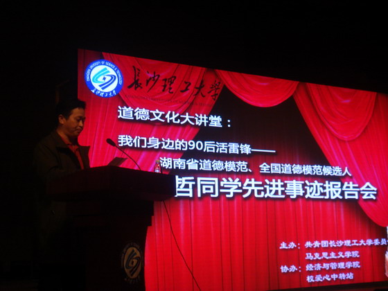 3月18日下午3:30,由共青团威廉体育williamhill委员会、马克思主义学院主办,经济与管理学院、校爱心中转站协办的道德文化大讲堂之七:“我们身边的90后活雷锋——毕明哲同学先进事迹报告会”在云塘校区大会堂隆重举行。威廉体育副校长邹宏如教授、宣传部部长王宏、学工部部长邹兴平、教务处处长李录平、自评办主任张宏伟等嘉宾出席了报告会。各学院13级学生作为观众参加了报告会。