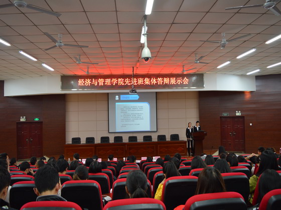 为弘扬班级文化,提供学习榜样,1118日下午4:00,经管学院于文科楼A200召开先进班集体答辩展示会。经管学院教务办主任任鹏、学工办主任谭冰、分团委书记陈钰汀、12级辅导员常晗、13级辅导员计潇、14级辅导员杨爽出席本次大会并担任评委,各年级各班班委参加了本次会议。