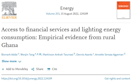 近日,经济与管理学院博士后留学生Bismark ADDAI与导师唐文进教授合作撰写的论文“Access to financial services and lighting energy consumption: Empirical evidence from rural Ghana”在国际SCI期刊Energy(2022年第253卷)发表。Energy由英国爱思唯尔科学有限公司出版,是能源环境工程技术领域最具影响力的权威期刊之一,该刊目前为中国科学院文献情报中心期刊分区大类一区期刊,JCR一区期刊,影响因子为7.147。
