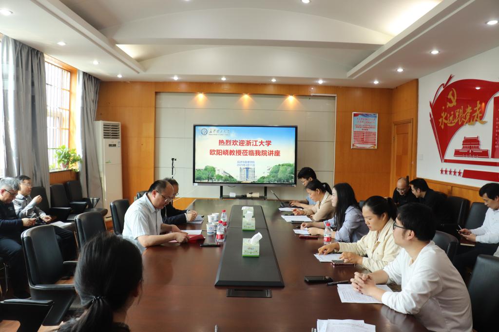 2025年4月11日上午,“2025年国家社会科学基金申报指导”系列专题讲座在经管大楼307会议室举行。浙江大学欧阳峣教授应邀主讲,讲座由彭新宇院长主持,20余名教师参加了本次讲座。