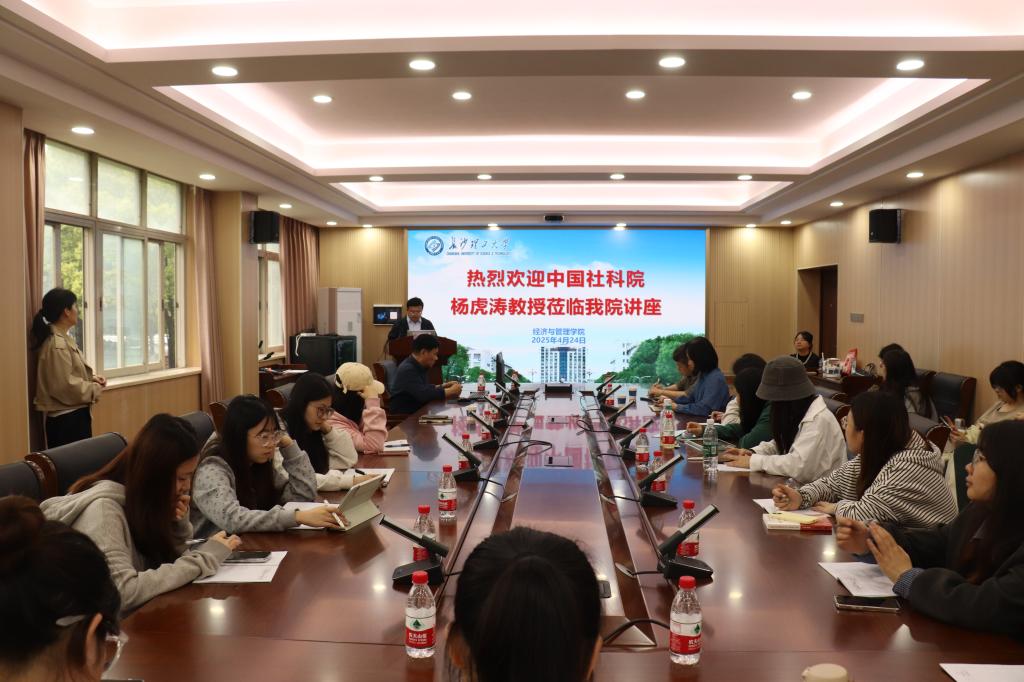 2025年4月24日下午,中国社科院杨虎涛教授应邀在经管大楼F202室主讲金岭学术大讲堂第56期(2025年第10期),主讲题目为“迈向高收入阶段的叠加转型与破局之道:比较与展望”。副院长王治、尹筑嘉出席,60余名师生参加了本次讲座,讲座由王治主持。