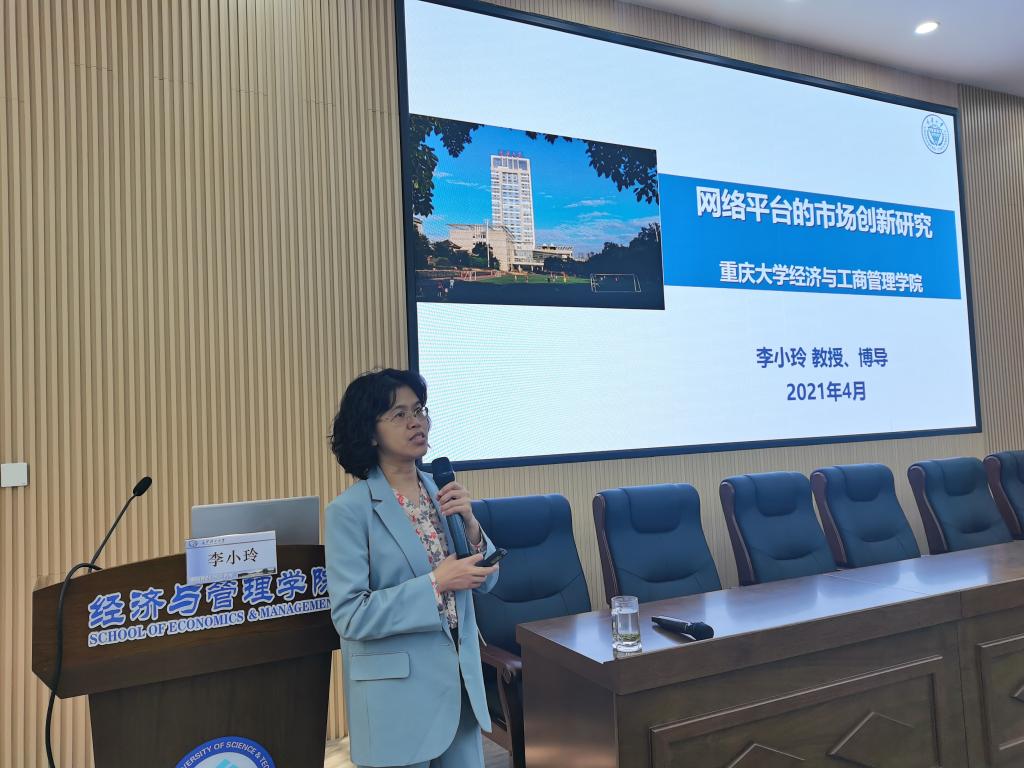 2023年11月3日上午,在经管大楼100报告厅,重庆大学研究生院副院长,经济与工商管理学院教授、博导、教育部青年长江学者李小玲受邀为我院本科生开讲工商管理类专业前沿系列名师专题课第七讲,主题为“网络平台的市场创新”。学院教师及学生代表100余人参加了此次课程。副院长何昊主持了此次授课活动。