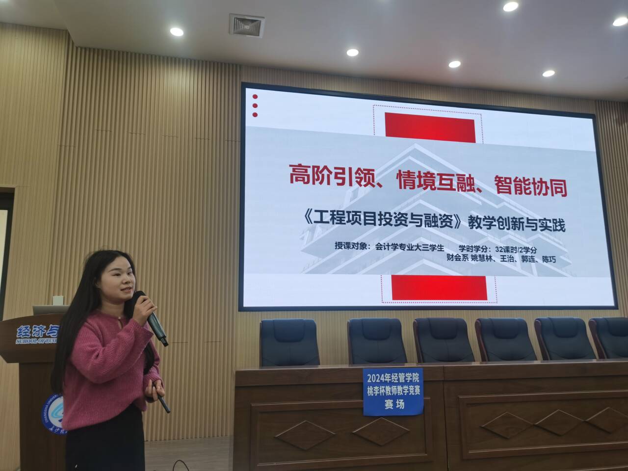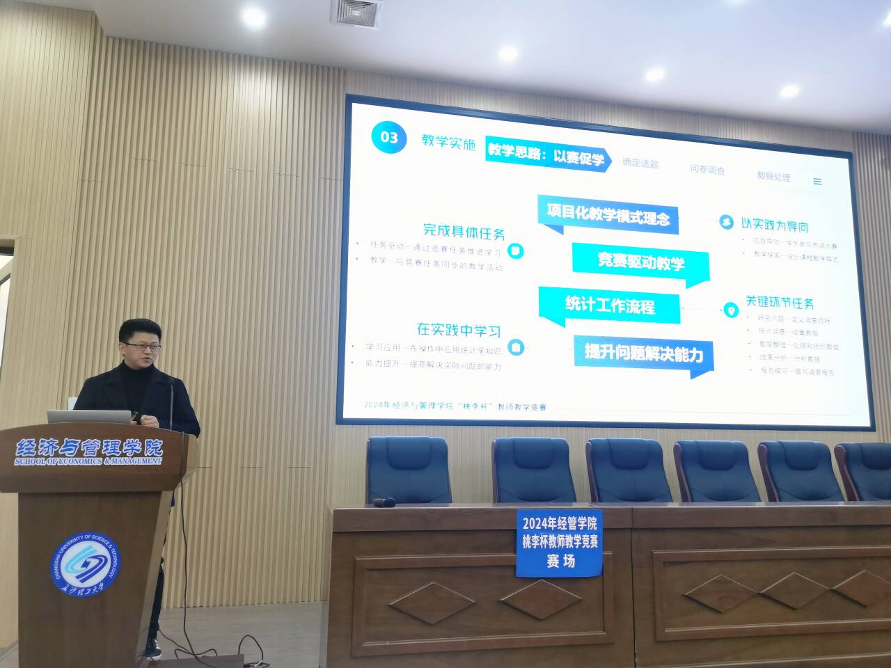 2024年12月15日14时,经管学院举行“桃李杯”教师创新教学竞赛现场赛,共有14个教学团队参加了本次竞赛。何昊副院长致开幕词,李祝平、曾志华、尹国君三位老师应邀担任竞赛评委,约50名教师现场观摩了比赛。