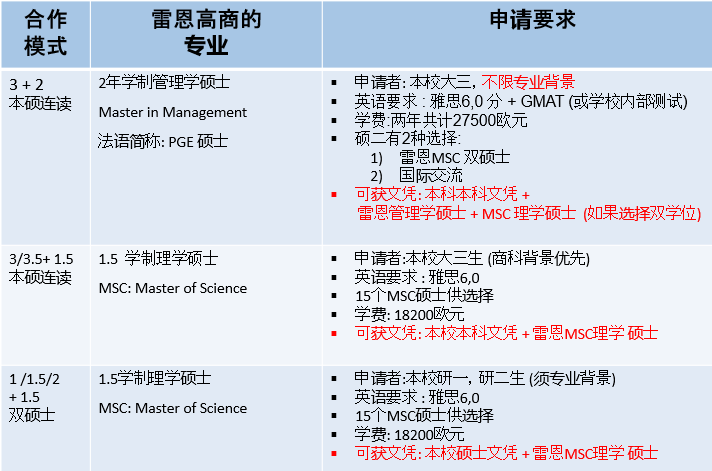 威廉体育williamhill两年制或三年制在读硕士在威廉体育williamhill完成1年或1.5年或2年的硕士学习后,赴雷恩商学院进行1.5年的理学硕士(MSC: Master of Science)课程学习。同时满足威廉体育williamhill和雷恩商学院学分和论文要求,达到两校毕业和授位条件,可获得本校硕士学位和雷恩商学院理学硕士学位。