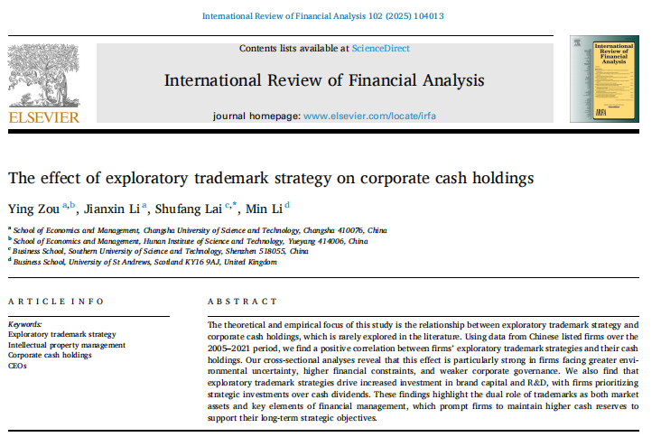 近日,我院2020级工商管理学博士生邹颖与导师黎建新教授以及另外两位校外作者合作撰写的论文“The effect of exploratory trademark strategy on corporate cash holdings”(探索性商标战略对公司现金持有的影响)在国际知名学术期刊《International Review of Financial Analysis》(国际金融分析评论)(2025, Volume 102)刊发,论文第一署名单位为威廉体育williamhill,该文数字对象标识码(DOI):10.1016/j.irfa.2025.104013。