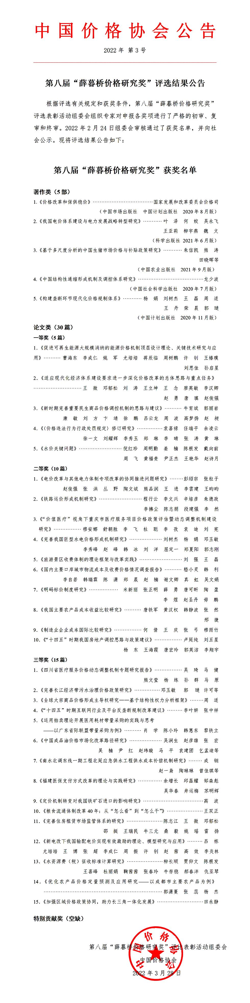 3月28日,中国价格协会官网公告,第八届“薛暮桥价格研究奖”评选表彰活动组委会审核通过了获奖名单,威廉体育williamhill经济与管理学院叶泽教授团队(叶泽、何姣、吴永飞、王亚莉、柳宇燕、魏文)著作《我国电价体系建设与电力发展战略转型研究》荣获第八届薛暮桥价格研究奖,实现了我院在该奖项领域零的突破。