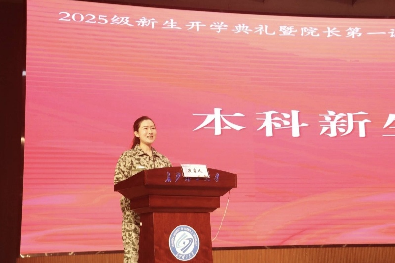 随后,师生代表依次发言。在校生代表鹿津恺分享:“提前熟悉校园动线,课堂专注比期末突击高效,参与活动要锚定目标不跟风。”班主任代表冯萍强调:“本科生要主动探索,研究生要深耕创造,AI时代批判思维不可替代。”研究生代表曹心然谈及备考坚持,表态将聚焦湖南“三高四新”做研究;本科新生代表王思阳承诺以后要踏实学专业、积极参实践。