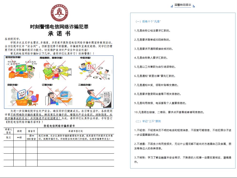 为确保经管学子在校期间人身、财产安全,提高学生的自我保护能力和防诈骗能力。近日,经济与管理学院组织全体学生进行了防范网络电信诈骗承诺书签订活动。本次活动共覆盖全院103个班级、900多间学生宿舍,累计4000余名学生参与,实现了反诈宣传教育的全面渗透。