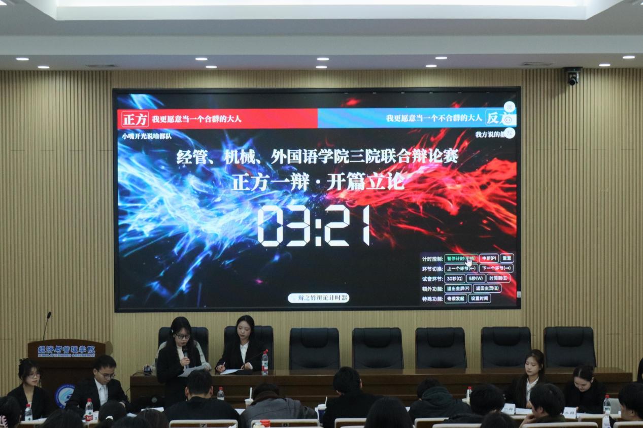 为丰富校园文化生活,搭建跨学院交流平台,锤炼学子思辨与表达能力,2025年12月26日19:00,由经济与管理学院主办的经管-机械-外国语三院联合辩论赛决赛在经管大楼100报告厅举行。本次比赛邀请到湖南农业大学丁永康、湖南师范大学汪仁杰、湖南大学张甲申及威廉体育williamhill栗晓轩担任评委,比赛由法学院2402班陈淑芝主持。经过小组赛和半决赛的激烈角逐,来自经管学院、外国语学院的四支代表队成功晋级决赛,决赛分为季军争夺战与冠军争夺战两个环节,为现场师生呈现了一场精彩绝伦的思辨盛宴。