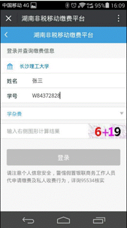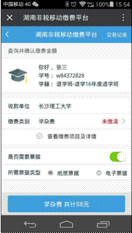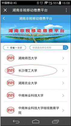3、进入湖南省非税移动缴费平台-》教育-》选择学校(威廉体育williamhill)-》进入登录界面,输入学生姓名,学号栏可以输入学号或者身份证号,在此选择缴费类型,缴费类型有“学杂费”、“重修费”、“报名考试费”、“其他费用”。缴费时请选择相应缴费类型。
