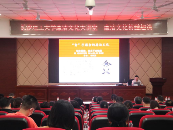 邓联荣以文化为切入点,围绕习近平总书记在湖南考察的足迹,强调了中华传统文化传承和新文化业态发展的重要性,指出廉洁文化的在反贪防腐工作中的不可或缺性。邓联荣精辟解读了“腐”和“贪”二字,深入分析了廉洁文化的精髓所在,以生动的案例引发在座师生思考互动如何以透明保廉洁,让权力在阳光下运行。最后,引用毛主席的反腐败语录“共产党员在政府工作中,应该是十分廉洁、不用私人、多做工作、少取报酬的模范”警戒大家要用积极阳光的心态去面对生活,共创清廉校园。