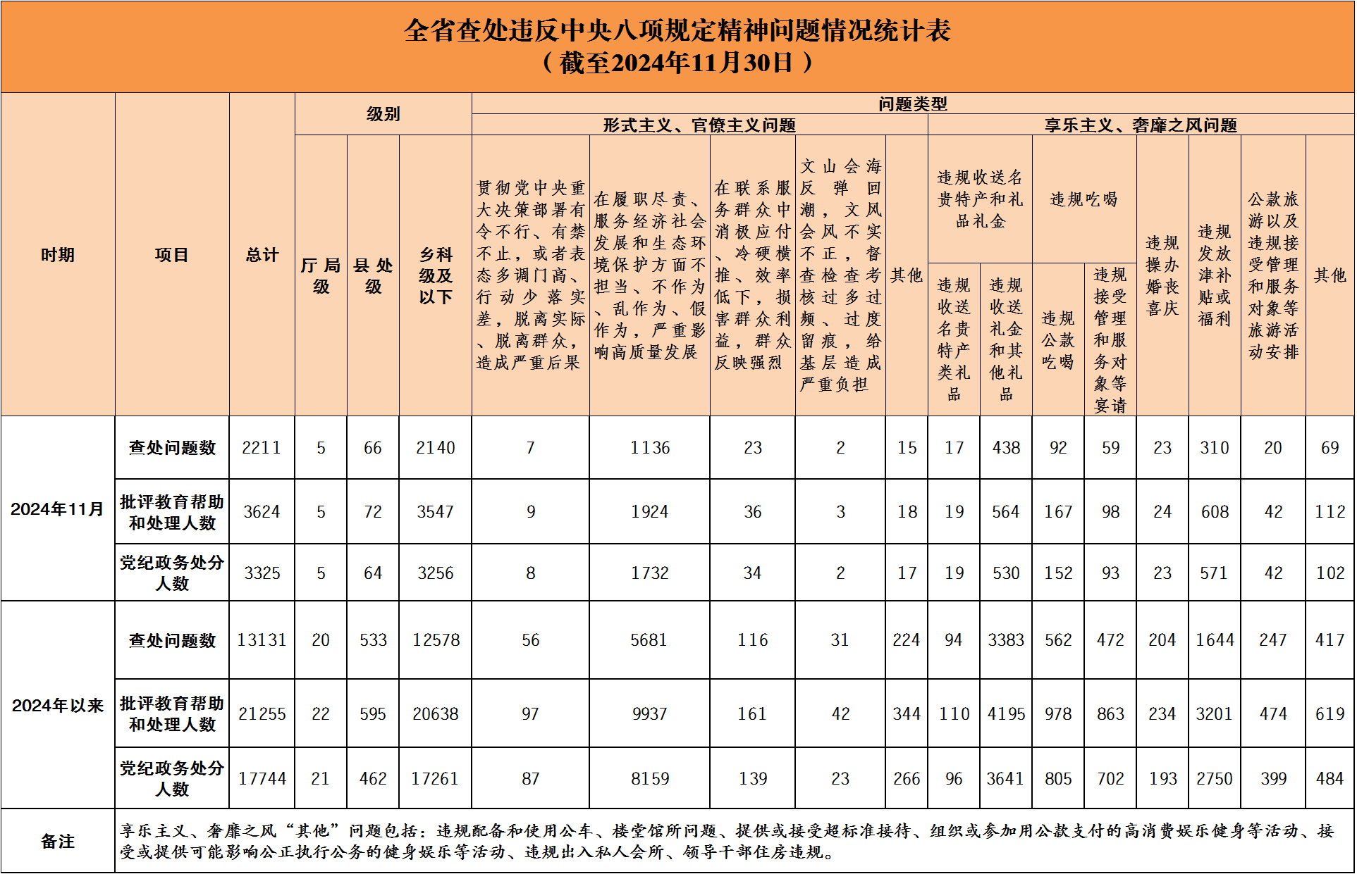 2024年11月全省查处违反中央八项规定精神问题2211起