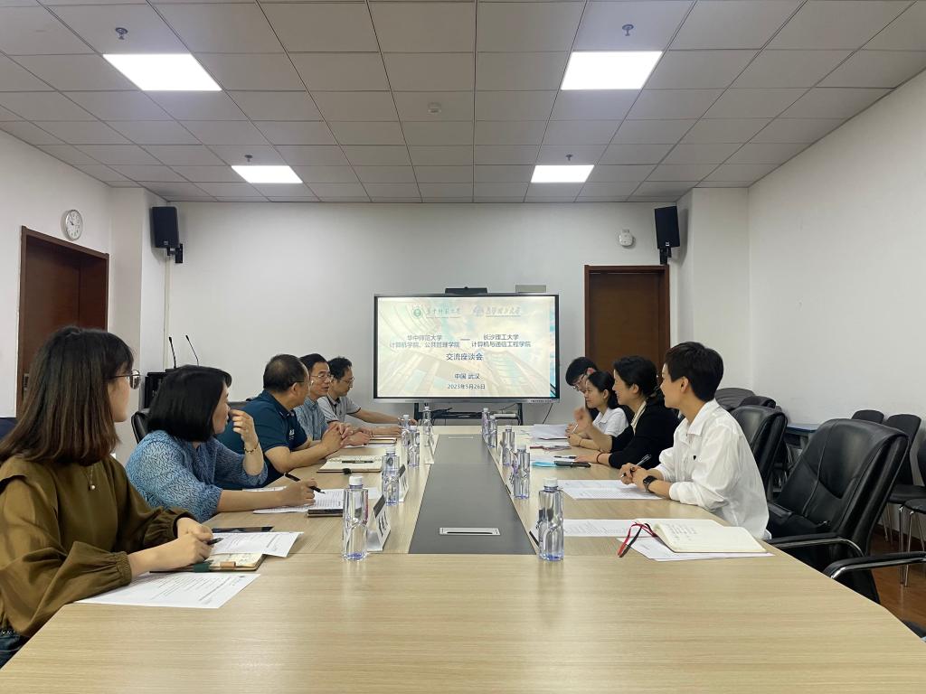 在华中师范大学,公共管理学院党委书记揭辉、党委副书记曾艳、计算机学院党委书记蒋兴鹏、党委副书记庄甲鹏及两学院学工办老师参加座谈。揭辉和曾艳重点介绍了学院党建引领下的育人平台“百社十年”建设经验及其孵化的学生竞赛成果,蒋兴鹏、庄甲鹏重点介绍了计算机学院依托专业社团开展学科竞赛的成果,以及学院、学校对有关竞赛的激励保障。揭辉还就教师队伍建设提出了自己的见解以及学院的举措。