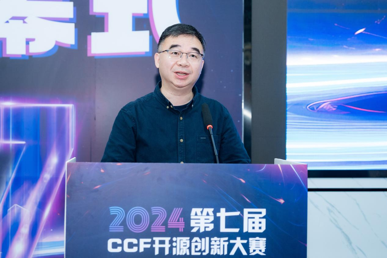 第七届CCF开源创新大赛组织委员会主席、湖南先进技术研究院可控开源创新中心主任水超作为组委会领导代表发言。他对赛事指导委员会等各方的策划和组织表示感谢,对本次大赛入围选手表示祝贺,最后表达了对入围决赛选手精彩表现的期待,期待同学们持续关注开源、参与开源,做出更多优秀开源成果,为国家开源生态建设做出更多贡献。