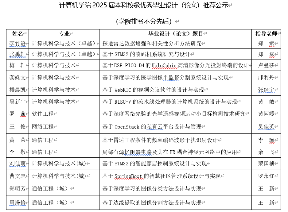 计算机学院2025届本科校级优秀毕业设计(论文)推荐公示