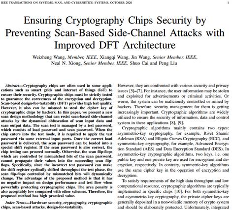 该论文“Ensuring Cryptography Chips Security by Preventing Scan-Based Side-Channel Attacks with Improved DFT Architecture”主要研究抗扫描攻击的加密芯片可测性设计结构。加密芯片应用非常广泛,其必须经过严格的测试,以保证加密和解密的正确性。扫描设计是一种常用的可测试设计(Design For Testability, DFT)技术,极大提高了测试质量,但也为黑客窃取密钥开启了后门。本文提出了一种新的扫描设计方案,在保证测试质量的前提下提高了芯片的安全性。当芯片进入测试模式时,需要通过一些外部输入端口输入测试密码(包括加载密码和扫描密码)。一旦输入了正确的加载密码,扫描密码就可以加载到一个特殊的移位寄存器中;如果扫描密码也正确,芯片测试可以正常进行。否则,由扫描密码中的不匹配位控制的扫描触发器将把虚假值传播到后续的扫描触发器中。该方案通过对扫描输入数据和扫描输出数据的动态混淆实现了抵抗基于扫描的侧信道攻击的目的。与同类方案相比本文方案的优点是,不但能够对加密芯片提供强有力的保护,而且不会对芯片性能和测试流程产生任何负面影响,硬件开销也非常之低。