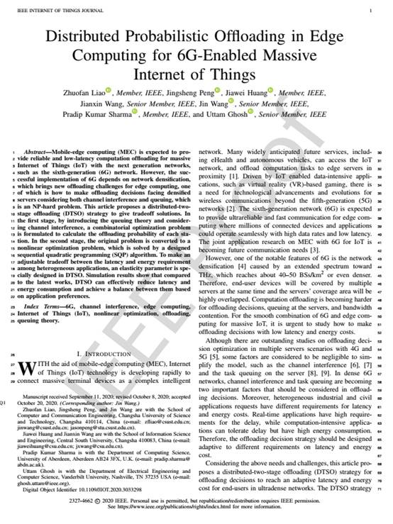 该论文“Distributed Probabilistic Offloading in Edge Computing for 6G-enabled Massive Internet of Things”主要研究了稠密基站环境下的边缘计算任务卸载问题。移动边缘计算(Mobile Edge Computing, MEC)能为物联网(Internet of Things,IoT)与下一代网络中产生的大规模计算提供可靠、低延迟的计算;而下一代网络(6G)的实现有赖于网络基站的致密性部署,这为边缘计算带来了新的卸载挑战,即如何针对加密服务器做出卸载决策的同时,考虑信道干扰和排队?这是一个NP难问题。本文提出了一种分布式两级结构提供权衡解决方案的卸载(DTSO)策略。一开始阶段,通过引入排队论和考虑信道提出了一个组合优化问题计算每个站点的卸载概率。在第二阶段,将原问题转化为非线性问题优化问题,并设计了二次规划(SQP)算法来获得较优解。另外,DTSO卸载策略中,还设计了关键弹性参数,使得边计算能考虑物联网终端对延迟和能量的不同需求进行权衡卸载,仿真结果表明,与最新研究表明,DTSO可以有效地降低延迟和能量。