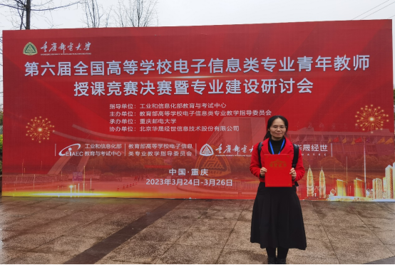 3月25~3月26日,由教育部高等学校电子信息类专业教学指导委员会举办的“第六届全国高等学校电子信息类专业青年教师授课竞赛决赛”在重庆邮电大学顺利开展。院通信工程系的吴志敏老师在决赛现场表现突出,以小组第一名的优异成绩荣获一等奖。