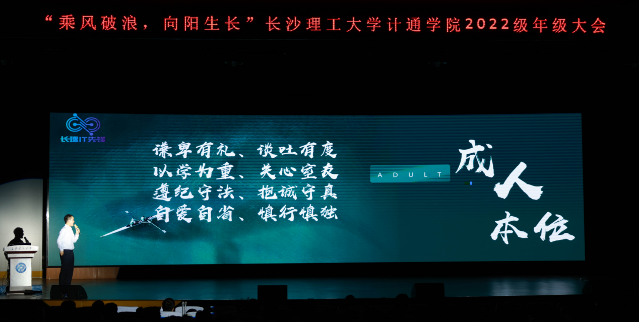 5月17日晚,计通学院在金盆岭校区5教大礼堂顺利召开2022级本科生年级大会。本次会议以“乘风破浪,向阳生长”为主题,院党委副书记王觊婧、22级辅导员唐菲楠出席,22级辅导员余泽宇主持,2022级全体本科生参会。