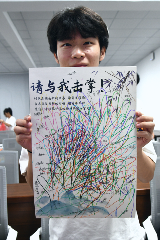 在主题团日活动中,同学们集中观看红色影片《无问西东》,该片通过四代青年在家国命运前的抉择与坚守,生动展现了青春奋斗的深刻内涵。活动创新设置“与我击掌”互动环节,同学们在A3卡纸上留下彩色手印、签名及奋斗誓言,以青春手迹铭记先辈精神。
