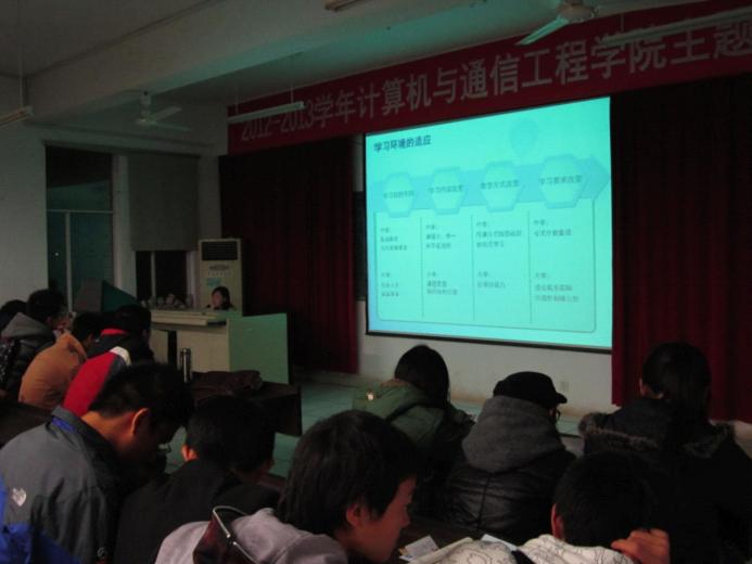 为帮助2012级计通学子尽快转变角色,更好的适应大学生活,计通学院于12月6号在理科楼B-311组织全体新生召开了新生心理适应讲座.