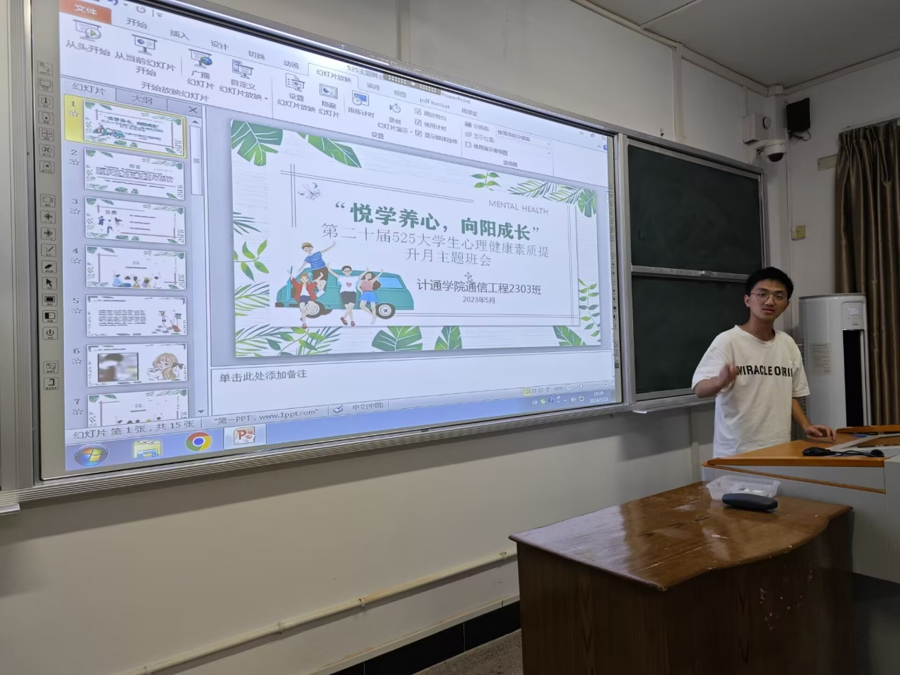 5月中旬以来,计通学院在金盆岭校区组织各班开展第二十届525大学生心理健康素质提升月主题班会——“悦学养心,向阳成长”,各班心委主持开展。