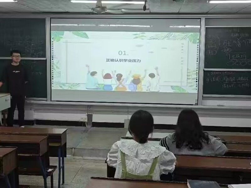 班会上,心委首先向同学们展示了大数据调研结果,研究表明学业是造成大学生心理问题的主要压力源这一现状,接着围绕正确认识学业压力、应对学业挫折和做好大学规划三个方面来帮助同学们克服学业问题带来的心理障碍。同时辅以相应的科普视频解说,来帮助同学们更好的理解学业压力这一心理问题。