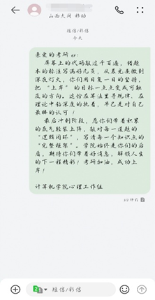 此次考研短信祝福活动,是计算机学院落实立德树人根本任务、深化人文关怀育人举措的生动实践。考研不仅是知识与能力的比拼,更是心态与毅力的较量,在冲刺的关键节点,学院通过精准化、暖心化的关怀举措,有效缓解了考研学子的焦虑情绪,增强了他们的备考信心。活动的开展,不仅拉近了学院与学子之间的距离,让学子们深切感受到学院大家庭的温暖,更凝聚了全院上下关心关爱考研学子的浓厚氛围,为营造积极向上、互助共进的育人环境奠定了坚实基础。