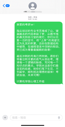 收到祝福短信后,学子们纷纷表示备受鼓舞。接下来,计算机学院将持续关注考研学子的备考状态,陆续推出一系列暖心护航举措,全方位为考研学子保驾护航,助力学子们圆梦理想院校。考研路上,学院始终与莘莘学子同在。
