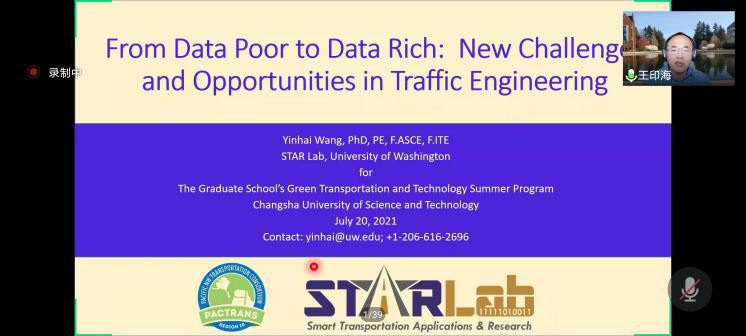 2021年7月20日上午八点半,华盛顿大学(西雅图)王印海教授应邀作了“交通工程所面临的机遇和挑战”的主题授课。本次授课由威廉体育williamhill郝威教授主持。