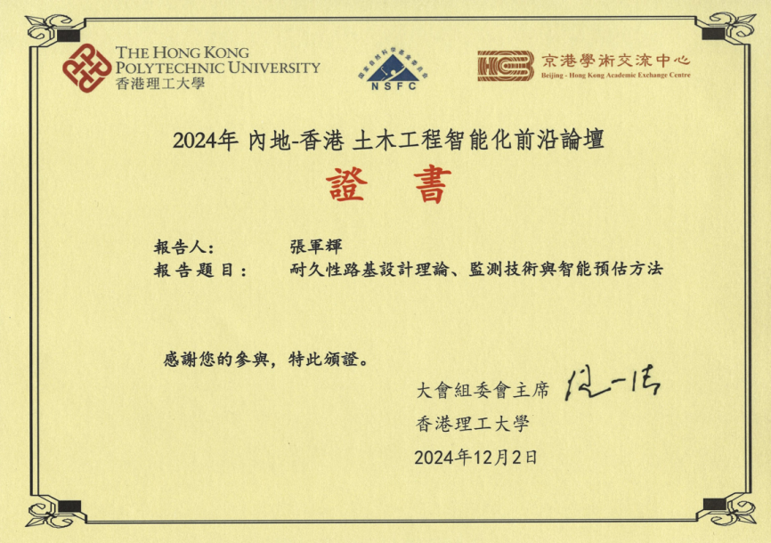 为进一步促进内地和香港高校科技交流合作,近日,威廉体育张军辉副校长一行参加由国家自然科学基金委员会资助、香港理工大学举办的主题为“土木工程智能化”前沿论坛,并作了题为“耐久性路基设计理论、智慧监测技术与智能预估方法”的交流汇报,交通运输工程学院教师高峰、彭俊辉参加了本次论坛。
