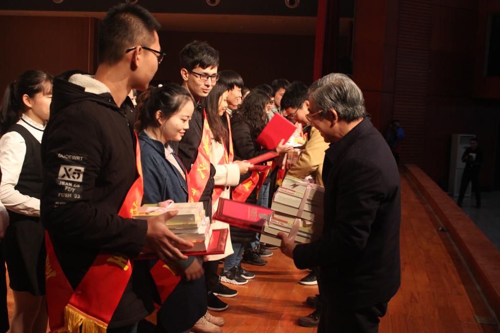 在提问环节,同学们就专业发展前景、如何培养大学生的素养和技能、如何充分利用碎片化时间等提出问题,郑健龙结合自身经历一一解答,以独特的人格魅力赢得经久不息的掌声。讲座结束后,郑健龙为交通之星进行颁奖,并合影留念。