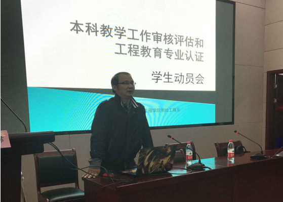 测绘工程系主任谢树春的动员围绕充分认识专业认证的重要意义、全面把握认证的内涵标准和全力以赴做好迎查准备三个问题展开。他首先为同学们介绍了测绘工程专业认证的概念、程序、方法、步骤等基本知识,要求同学们充分认识认证的重要意义;随后,谢主任从多个个方面,结合学校和学院实际,生动详实地解读了测绘工程专业认证标准的具体内容;最后,谢主任对同学们提出了三点要求和希望:一要认真学习,端正态度;二要严格要求、主动参与;三要展示风采,争做贡献。勉励师生共同努力,争取以优异的成绩通过测绘工程专业认证。