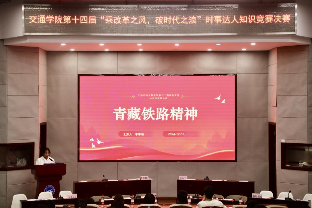 12月18日,正值我国第46个改革开放纪念日之际,交通运输工程学院举办了第十四届“乘改革之风,破时代之浪”时事达人知识竞赛决赛。比赛在工科二号楼的交通科技报告厅举行,学院关工委常务副主任吴滨老师、学工办辅导员彭笠老师,各支部副书记及100余名观众出席了此次活动。