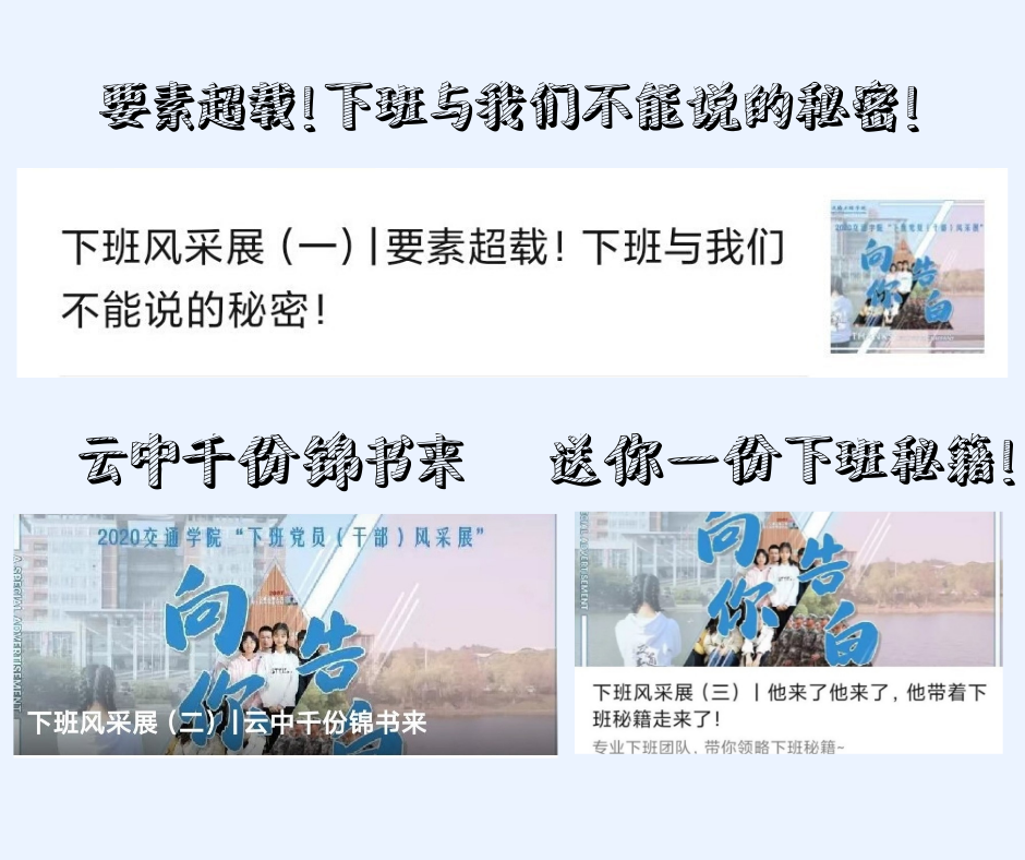本次活动,前期向老师、所下班级同学收集各类素材,通过“长沙理工交通青年”公众号进行了三期推送展示:下班与我们不能不说的秘密、云中千份锦书来、下班秘籍,主要介绍了下班在所下班级中在思想引领、学习和生活上的指导,以及和2019级同学们相处的共同美好回忆。在一张张照片、一封封信、一幅幅画、一个个视频中,展示了下班们在2019级同学中的引领作用及深厚情谊。通过下班们和2019级同学的留言互动,更加感受到了下班对所下班级同学无微不至的照顾与辛勤付出。