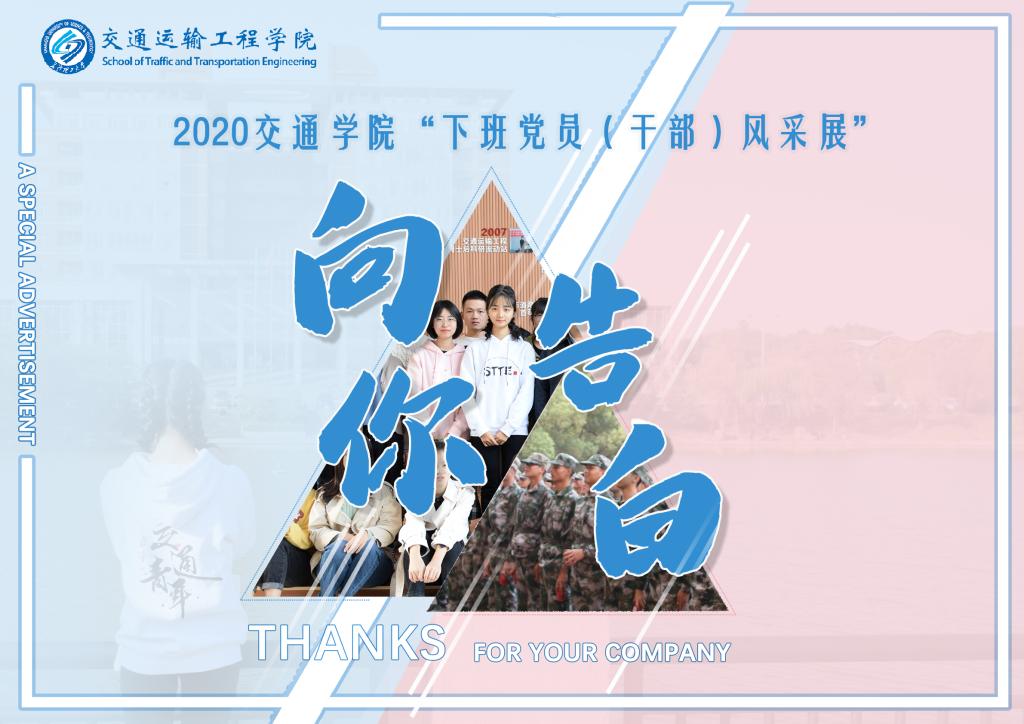 有这样一群人,来自高年级学生之中,坚守在低年级学生思想引领和生活帮扶一线,用耐心、细心、贴心陪伴大一新生、帮助他们更好成长,他们就是交通学院的“下班党员(干部)”们。为让同学们更好认知下班以及他们的工作,将“下班精神”传递给更多人,交通学院于2020年4月18日至4月21日开展了线上“下班风采展”活动。