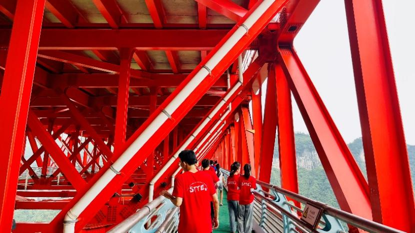 实践团最后来到矮寨大桥,领略德夯大峡谷的自然风光,近距离感受大桥的宏伟景象,成员们倍感震撼,为我国先进的桥梁建造技术感到自豪。在工作人员的讲解下,成员们深刻体会到大桥建设的艰难历程,建设者们不畏艰险,攻克了一个又一个技术难关,这种大国工匠精神激励着成员们将延续这种不惧挑战的奋斗精神,将所学专业知识运用到国家的交通建设之中。