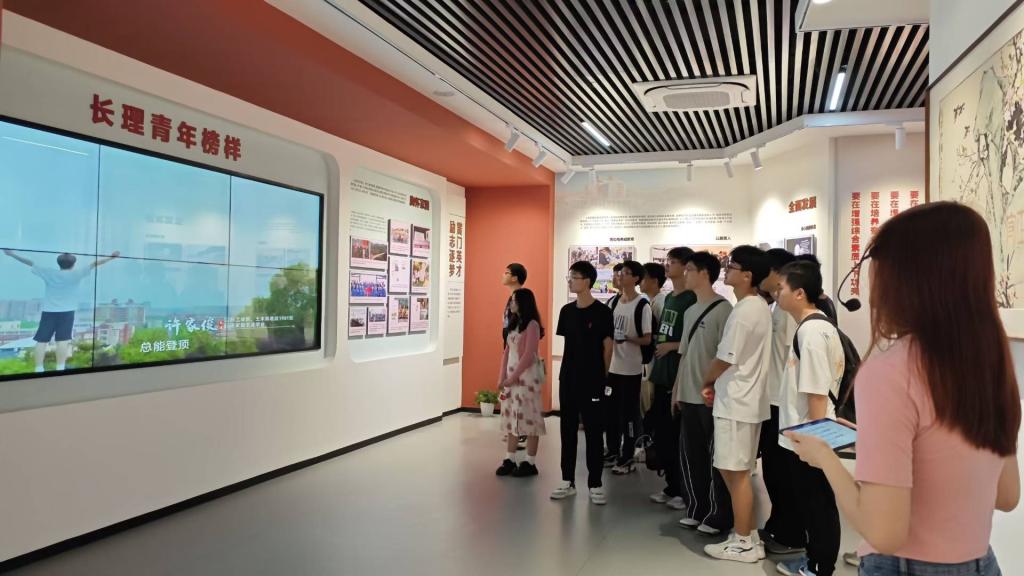 三全育人馆内,一幅幅照片、一段段文字记录着学校的历史与发展,展现了学校在培养学生“德智体美劳”全面发展的不懈追求和卓越成就。同学们围绕“国之大者”,“材之茂者”,“师之贤者”,“行之实者”四个主题步步深入,在这里,新生能看到学校发展历程中的里程碑事件,更能从中体会到学校的育人信念。 新生们跟随导览员的步伐,沉浸于学校的历史长河,感受着前辈们的奋斗历程和荣誉时刻。在港珠澳大桥模型前,讲解员介绍道:“由于超大的建筑规模、空前的施工难度和顶尖的建造技术,港珠澳大桥闻名世界,而其中建设参与人员有30%的长理学子”,校友在各个领域里的卓越贡献,同学们不由心生敬佩,增长信心,立志将学校的育人理念转化为自身成长的动力。