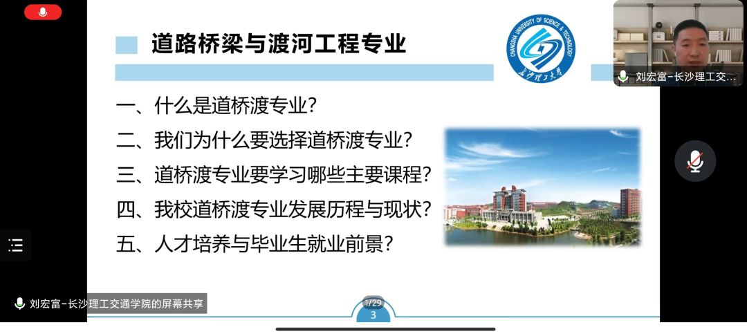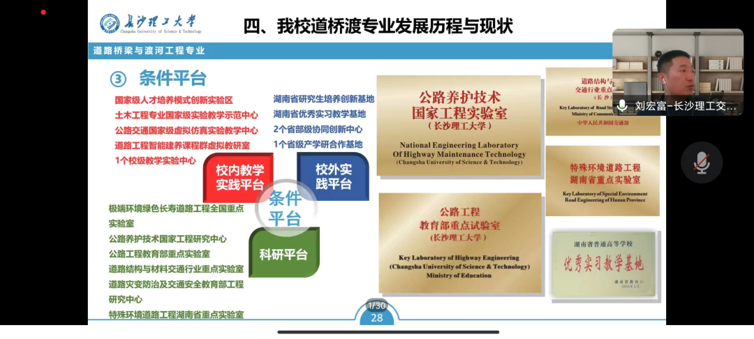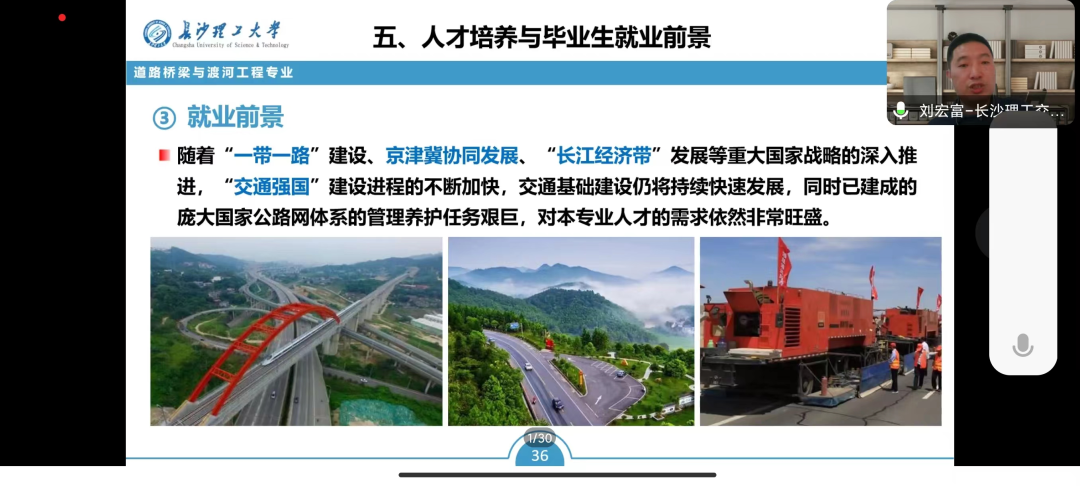 肖杰着重介绍了道路桥梁与渡河工程专业的雄厚的师资力量、成熟人才培养方案及建有多个国家级和省部级科研平台,培养了大批“底色亮、实践强、有情怀、敢担当”的高素质工程技术人才。