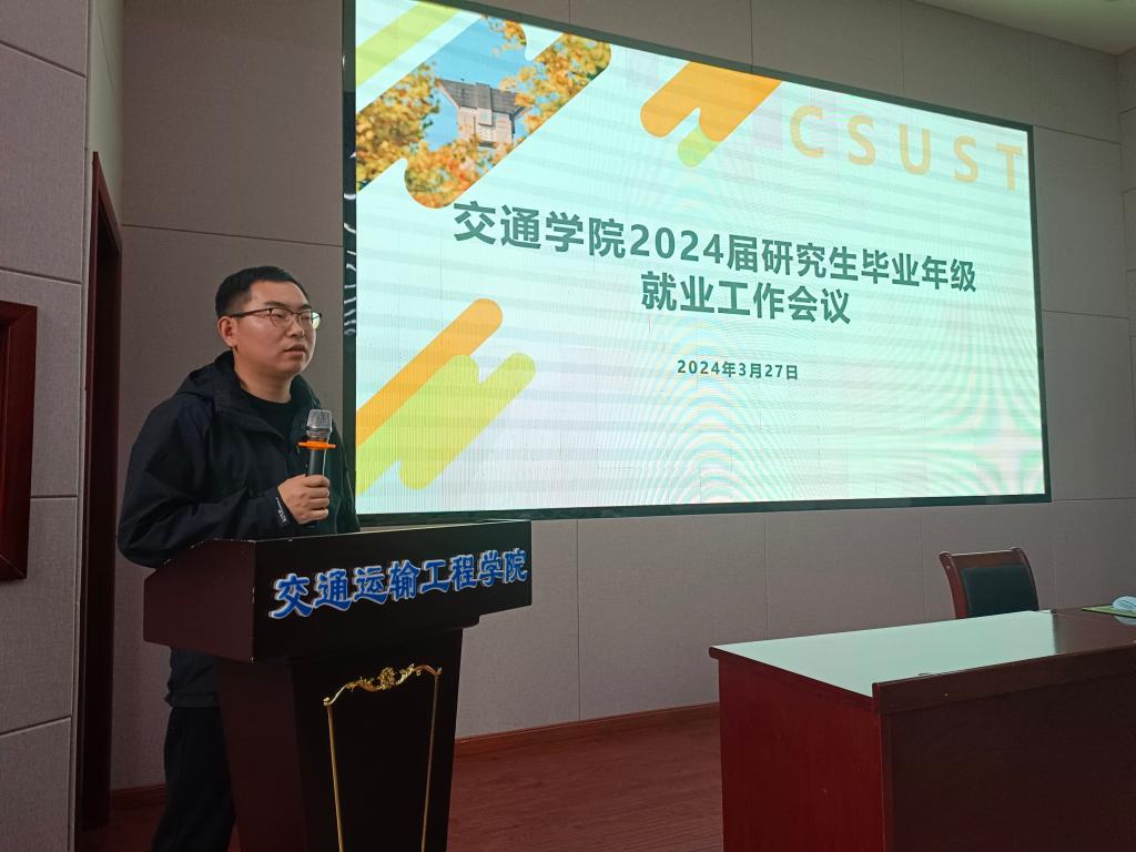 会议由研究生辅导员周浩主持,就业专干教师李特超根据往届毕业生的求职情况,具体分析了今年春季就业形势,点明本届毕业生面临的就业形式,综合分析了2024届交通学院毕业生的求职情况,给出了应对措施,李特超老师给予了研究生同学良好的建议:要明确自己的需求,扩大求职面,不设置过高期待;鼓励学生“先就业,后择业”,提醒大家“不要把鸡蛋放在一个篮子里”。