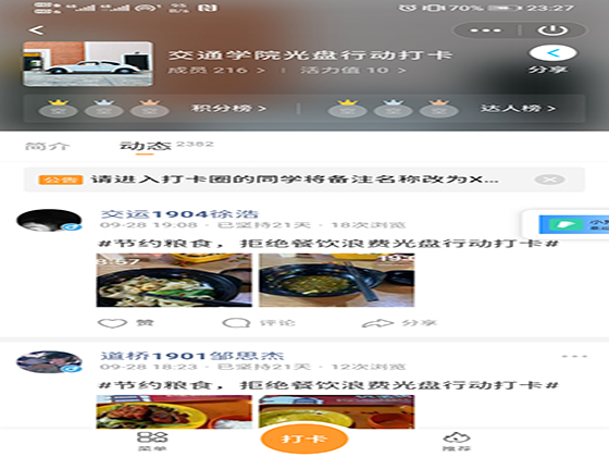 本次活动以“光盘行动打卡+创意作品征集”形式,进行校级比赛。同学们踊跃报名,积极参加,不仅坚持完成为时二十一天的光盘行动打卡,同时创作深入贯彻“节约粮食,拒绝餐饮浪费”理念的作品。最终,交通学院在校级评比中获得征文类作品二等奖、三等奖,书画类作品三等奖和优秀组织奖。