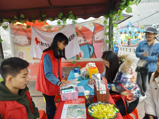 红星大市场献血车无时无刻为市民提供无偿献血的服务,积极做好紧急救援的工作,护士们和红十字志愿者们为长沙市民竭诚服务。