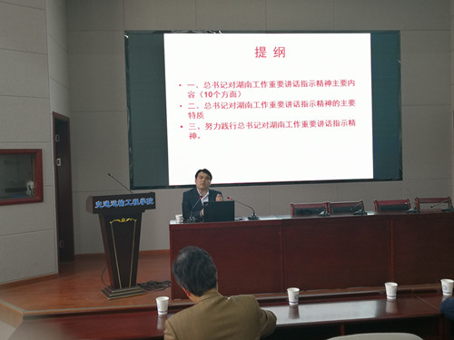 易显飞教授从总书记对湖南工作重要讲话指示精神主要内容、总书记对湖南工作重要讲话指示精神的主要特质和努力践行总书记对湖南工作重要讲话指示精神三个方面对总书记关于湖南工作的重要讲话精神进行深入浅出的阐述。易教授谈到,总书记对湖南关怀备至,十八大以来,多次对做好湖南工作发表重要讲话、作出重要指示。这些重要指示,是习近平新时代中国特色社会主义思想在湖湘大地的具体化,是新时代建设富饶美丽幸福新湖南的根本遵循。
